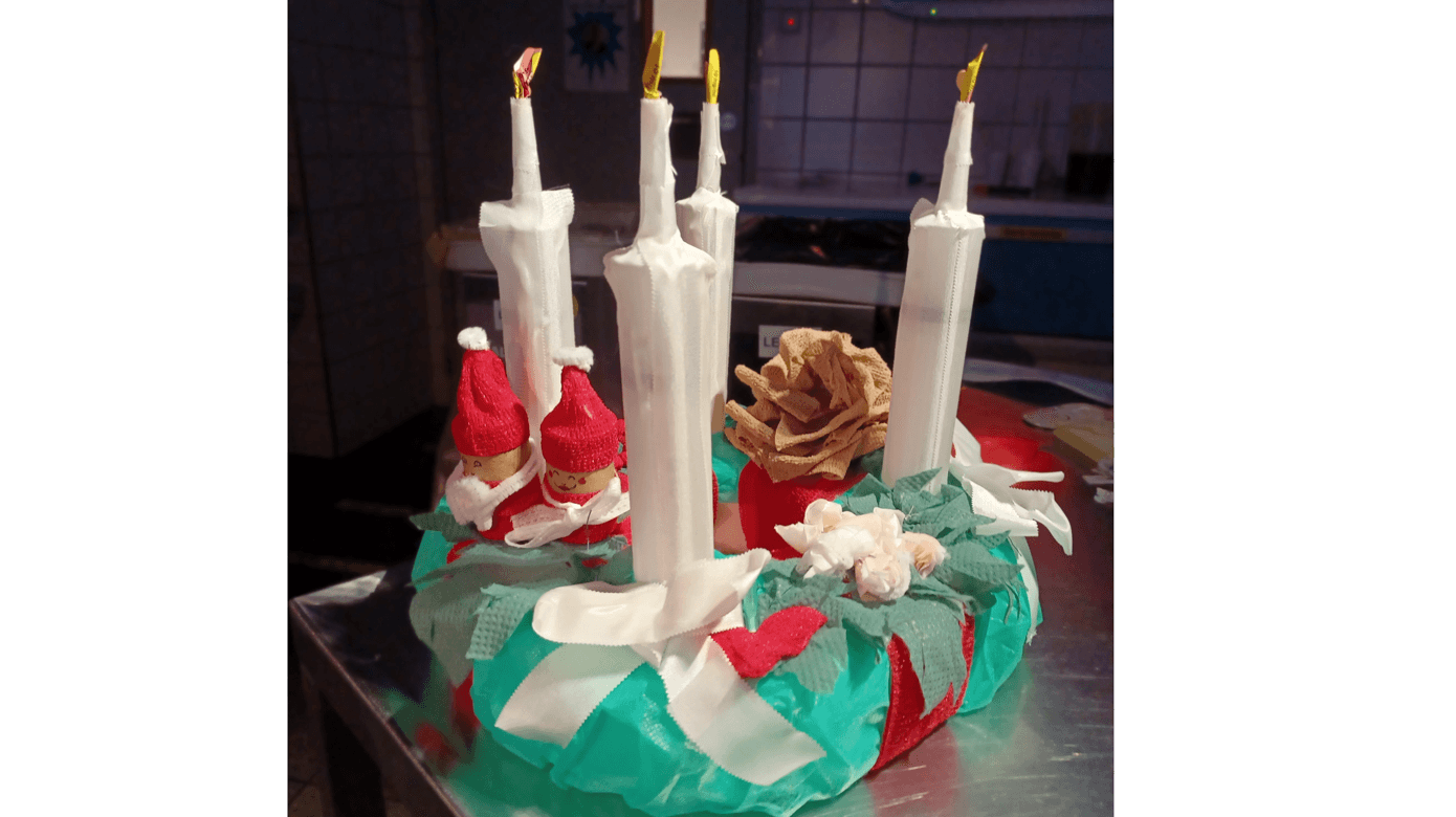 Her vises en adventskrans lavet udelukkende af udstyr tilgængeligt på en operationsstue indeholdende både gran, bånd, lys, kogle, sne- og kristtjørnbær, sløjfer og nisser.