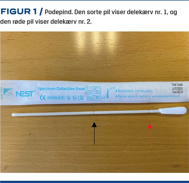 En 65-årig kvinde blev henvist til en kirurgisk afdeling fra et COVID-19-testcenter under diagnosen »slugt podepind«. Da patienten havde haft feber to dage forinden, anbefalede egen læge COVID-19-podning. Under podningen udløstes patientens svælgrefleks, hvilket fik hende til at bide hårdt sammen om podepinden, der knækkede ved en delekærv (Figur 1) og blev slugt. Podepersonalet observerede, at halvdelen af podepinden manglede fra delekærv nr. 1, hvilket er et fremmedlegeme på 8 cm, mens patienten følte, at hun sank spidsen fra delekærv nr. 2, som er et fremmedlegeme på 3 cm. Patienten blev efterfølgende podet succesfuldt og henvist til den kirurgiske afdeling til akut vurdering. Ved ankomsten var hun upåvirket uden dyspnø eller smerter. Hun havde indtaget vand per os under overflytningen. Hun blev vurderet af en kirurg, og man valgte at sætte hende til at faste og foretage gastroskopi i vagten, da en podepind er et spidst fremmedlegeme. COVID-19-status hos patienten var fortsat ukendt, og derfor blev der udført akut COVID-19-point of care-test inden skopien. Testen var negativ. Patienten blev gastroskoperet ni timer efter, at fremmedlegemet var slugt. Dette foregik i fuld bedøvelse for at beskytte luftvejene. Her fandt man til og med duodenums andet stykke en upåfaldende øvre gastrointestinalkanal uden synligt fremmedlegeme. Det blev konkluderet, at podepinden var passeret videre ned i jejunum og dermed ikke var mulig at fjerne endoskopisk. Patienten blev udskrevet i velbefindende næste dag og instrueret i at henvende sig akut i tilfælde af abdominalsmerter. Der var telefonisk opfølgning to uger efter indlæggelsen. Patienten havde siden gastroskopien været i velbefindende og podepinden var ikke observeret kvitteret med afføringen, som dog kun blev observeret sporadisk af patienten.