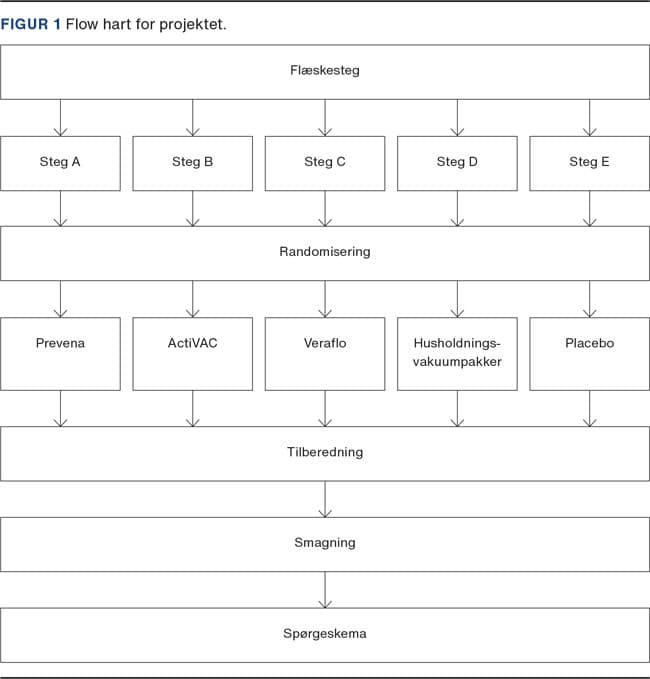 De fem stege blev drysset med salt svarende til 0,8% af kødvægten. Herefter blev de pakket i hver sin sous vide-pose. For steg A (Prevena), B (ActiV.A.C.) og C (Veraflo) tilsluttedes systemet i henhold til instruks. Lækager forstærkedes. Veraflo blev indstillet til instillationsvolumen 8 ml, udblødningstid 2 min (Knorr svinebouillon, en terning opløst i 100 ml kogende vand herefter siet og injiceret i 500 ml isotonisk natriumklorid) hver halve time. For steg D (husholdningsvakuumpakker) skabtes der et vakuum, og posen svejseforsegledes. Steg E (intet vakuum) blev kommet i pose uden yderligere. Sous vide (Steba SV50) blev indstillet på 63 °C, og de fem stege blev lagt i vandbadet i fire timer i henhold til opskrift [5].