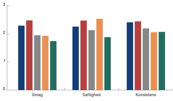 Ved vurdering af stegene blev de generelt vurderet godt. I alle kategorier blev steg A (Prevena) og steg B (ActiV.A.C.) vurderet i toppen, fraset for saftighed, hvor steg D (husholdning) var bedst. Vurderingsscore fremgår af Figur 2. Flest favoritvurderinger tilfaldt steg B (ActiV.A.C.) dernæst steg A (Prevena), hvor de øvrige stege placeredes i bunden. Favoritvurderinger fremgår af Figur 3.