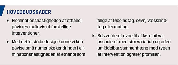 Vi viser i dette studie, at eliminationshastigheden af ethanol muligvis kan påvirkes af simple interventioner, men at det i så fald er så minimalt, at det formentlig ikke vil have en praktisk betydning. En vigtig konklusion er, at personer, der er påvirket af ethanol, ikke selv ser ud til at kunne vurdere, om de er i stand til sikkert at føre et køretøj.