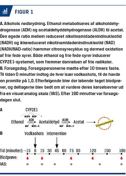 Fire frivillige forsøgspersoner i alderen 19-55 år, to mænd og to kvinder, deltog i studiet. Alle forsøgsdeltagere havde et alkoholforbrug under Sundhedsstyrelsens anbefalede antal genstande (syv genstande pr. uge for kvinder og 14 for mænd). Forsøget blev udført på to uafhængige forsøgsdage, én interventionsdag og én kontroldag, som begge strakte sig over ca. 3,5 timer. Begge dage mødte alle forsøgsdeltagere op efter ti timers faste og fik i den ene antekubitale vene anlagt et perifert venekateter, hvorfra blodprøver kunne trækkes. Til tiden 0 minutter indtog hver deltager vodka (37% vol.) peroralt til de havde en promille på 1,0. Den mængde alkohol, som hver deltager skulle drikke for at opnå en promille på 1,0, blev udregnet ved hjælp af Wildmarks formel [9]: