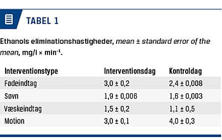 Formålet med dette studie var at undersøge, om ethanols eliminationshastighed kunne øges ved hjælp af forskellige interventioner, og om man efter ethanolindtagelse selv kunne vurdere sin evne til at føre en bil. Ved både fødeindtag og væskeindtag var der en let stigning i eliminationshastigheden af ethanol på interventionsdagen sammenlignet med kontroldagen. Ved at dyrke motion så det derimod ud til, at eliminationshastigheden blev nedsat. Der var meget ringe sammenhæng mellem ethanolkoncentrationen og den selvvurderede evne udi bilkørsel.