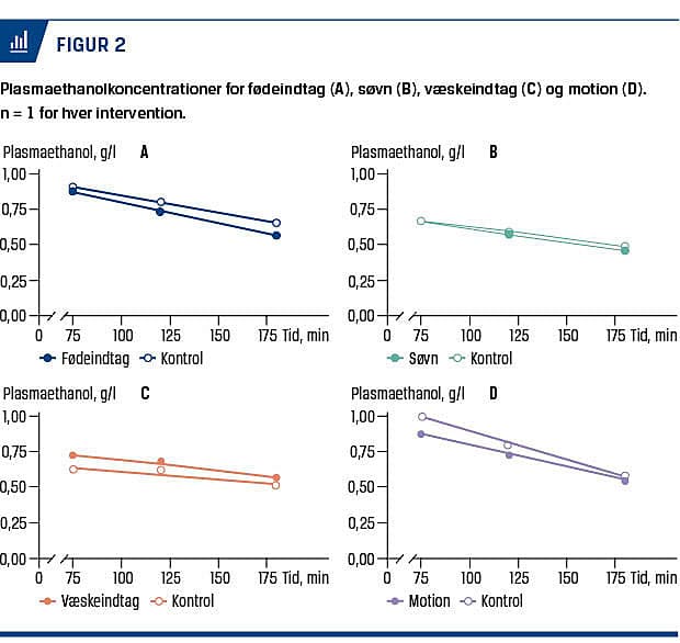 På interventionsdagen var Cmax for ethanol 0,87 g/l efter 75 minutter og 1,00 g/l på kontroldagen også efter 75 minutter. Efter 180 minutter var disse værdier faldet til henholdsvis 0,55 og 0,58 g/l. Ethanols eliminationshastighed var 3,0 g/l × min–1 og 4,0 mg/l × min–1 på henholdsvis interventionsdagen og kontroldagen (Tabel 1 og Figur 2D).