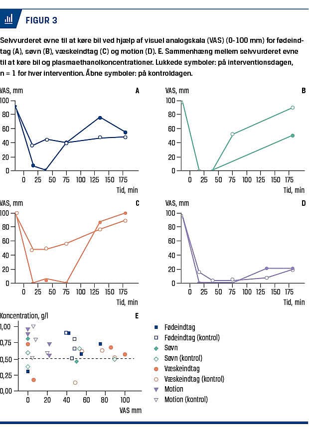 Den laveste selvvurdering var efter 40 minutter på interventionsdagen (0 mm) og efter 15 minutter på kontroldagen (37 mm). Efter 180 minutter vurderede deltageren på interventionsdagen sine kørselsevner til 55 mm og på kontroldagen til 48 mm (Figur 3A). Forsøgsdeltageren vurderede sine kørselsevner værre efter fødeindtag end efter samme ethanolindtag og efterfølgende faste.