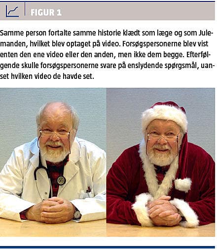 Materiale og metoder: Vi foreviste 52 tilfældigt udvalgte forsøgsdeltagere en video, hvor en historie blev fortalt af hhv. en person i julemandskostume og den samme person iklædt lægekittel. Herefter vurderede vi forsøgspersonernes opfattelse af fortællerens troværdighed og venlighed på baggrund af et struktureret interview.