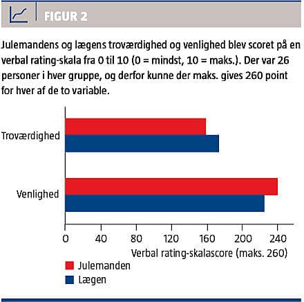På troværdighedsskalaen var lægens samlede score 176 ud af maks. 260 point, lidt højere end Julemandens, 154 ud af maks. 260 point, men forskellen var dog ikke statistisk signifikant (p = 0,524) (Figur 2).