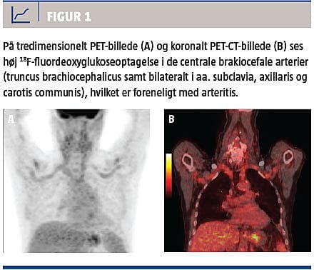 Kæmpecellearteritis (KA) er en sjælden sygdom med en årlig incidens på 17 pr. 100.000 personer over 50 år. De typiske symptomer er hovedpine og skalpømhed. Behandlingen af KA er højdosis prednisolon, som bør institueres blot ved klinisk mistanke for at forhindre retinaiskæmi og blindhed. For en sikker diagnostik af KA kræves biopsi af arteria temporalis, men negativt resultat af biopsi udelukker dog ikke KA på grund af skip lesions. Tilgængeligheden af PET-CT er i løbet af de senere år blevet kraftigt forbedret, og denne undersøgelse benyttes især til diagnostik og monitorering af maligne sygdomme. Vi præsenterer her en sygehistorie, hvor KA blev diagnosticeret ved PET-CT med 18F-fluordeoxyglukose (FDG) [1].