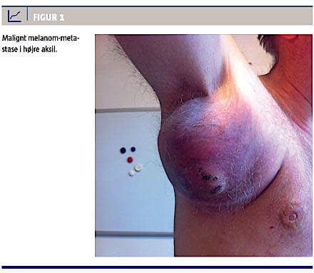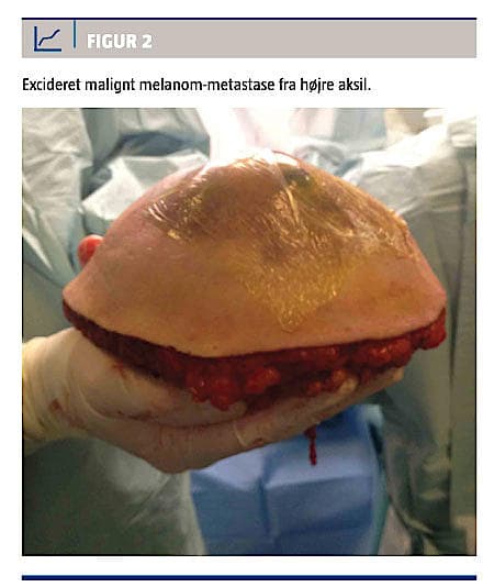 En diagnostisk finnålsbiopsi afslørede malignt melanom-metastase. Patienten blev henvist til behandling på en plastikkirurgisk afdeling. Objektivt fandtes her ingen primær hudtumor, ingen palpable lymfeknuder i øvrige lymfeknudestationer. Ved en klinisk øjenundersøgelse og koloskopi sås ingen tegn til malignitet. Der blev udført CT-TAP (thorax, abdomen, pelvis) inklusive ekstremiteterne, og der blev ikke fundet tegn til disseminering. Patienten fik foretaget excision af metastasen samt højresidig aksileksairese med efterfølgende rekonstruktion af defekt med stilket latissimus dorsi-lap med delhudstransplantation til donordefekt på ryg. Det exciderede præparat målte 35 × 25 × 20 cm og vejede 1,675 kg (Figur 2). Postoperativ infektion i hudtransplantatet gjorde, at patienten måtte retransplanteres, men han var herefter komplikationsfri. Patienten genoptog sit arbejde efter operation med fuld kraft og funktion i sin højre overekstremitet efter tre måneder. Klinisk kontrol og efterfølgende tre- og timåneders PET-CT viste ingen tegn til recidiv.