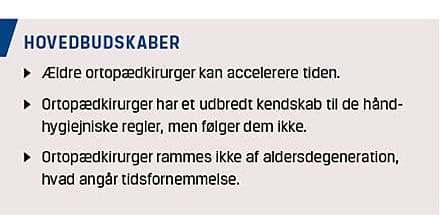 desinfektion der er den bedste [4]. The Association for Perioperative Practice (AfPP) anbefaler, at man forud for dagens første kirurgiske indgreb indleder med en grundig håndvask og renser neglene med en neglerenser. Denne håndvask bør udføres med sæbe eller en antimikrobiel blanding og foretages under rindende vand. Kirurgen skal derefter foretage en 120 s varende afspritning eller traditionel afrensning med en antimikrobiel opløsning. AfPP anbefaler afspritning, da denne antages at reducere antallet af bakterier mest effektivt. Det er opfattelsen blandt forfatterne til dette studie, at entusiasmen, med hvilken denne afspritning foretages, varierer betydeligt blandt kirurger. Evnen til af udføre en fuld kirurgisk håndvask og afspritning på under et halvt minut synes især at være udtalt hos mere seniore kirurger, hvorimod deres yngre kollegaer efterlades i evigheder uden for operationsstuen, baskende som vingeskudte ænder med sprit på hænderne. Det er tidligere påvist, at den individuelle tidsopfattelse accellerer med stigende alder, således at 120 s opleves 28,3 s hurtigere for personer over 50 år end for personer under 30 år [5, 6]. Dette kan være forklaringene på en evt. tidsforskel i afspritning imellem yngre og mere seniore kirurger.