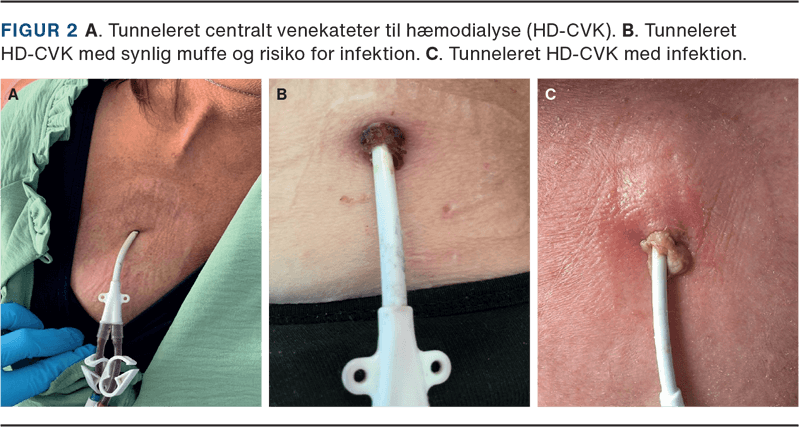 Infektion udgået fra et HD-CVK (Figur 2) inddeles i exit-site, tunnelinfektion samt bakteriæmi [20, 22]. Den primære agens for infektionerne er grampositive kokker, især Staphylococcus aureus og S. epidermidis (80% af tilfældene) [22]. De fleste studier har fundet en incidens af HD-CVK-relateret bakteriæmi på 3-6 episoder pr. 1.000 kateterdage [20, 23]. HD-CVK-relateret sepsis står for 25% mortalitet hos patienter med HD, og forekomsten er ca. ti gange højere hos patienter med et HD-CVK sammenlignet med patienter med en AV-fistel [23, 24]. Risikoen for udvikling af endokarditis hos patienter med HD er 24 gange større end den generelle befolkning [25, 26]. Det er derfor uhyre vigtigt at have fokus på håndteringen af et HD-CVK. Korrekt håndhygiejne, aseptisk teknik ved anlæggelse, aseptisk eller non-touch-teknik skal anvendes til håndtering og pleje af kateteret. Et HD-CVK håndteres kun af sygeplejersker med kendskab til det, medmindre der er akut behov for en i.v.-adgang. Det er vigtigt med opmærksomhed på, at en patient med HD altid er i højrisiko for en bakteriæmi, da der er adgang til deres blodbane flere gange om ugen. Forskellige lukkeopløsninger med antibiotika har været forsøgt, men bliver kun anbefalet til specifikke patientgrupper, f.eks. patienter i højrisiko for infektion og uden mulighed for andre adgange. Lukkeopløsningerne anbefales ikke som standardbehandling [3].