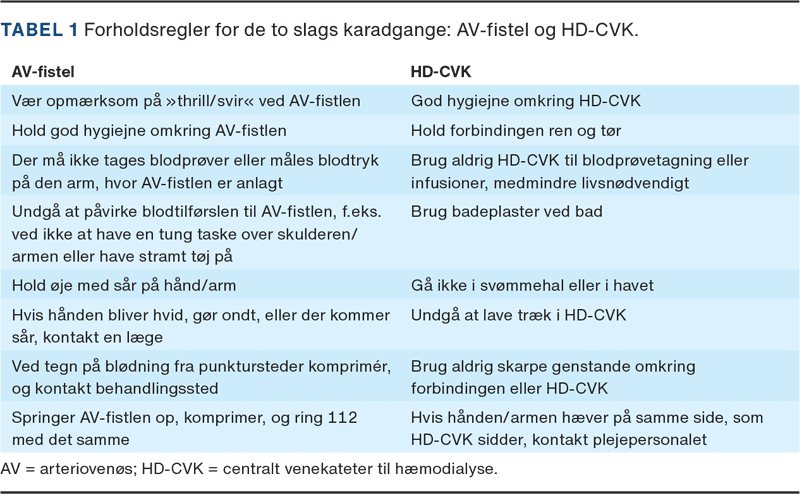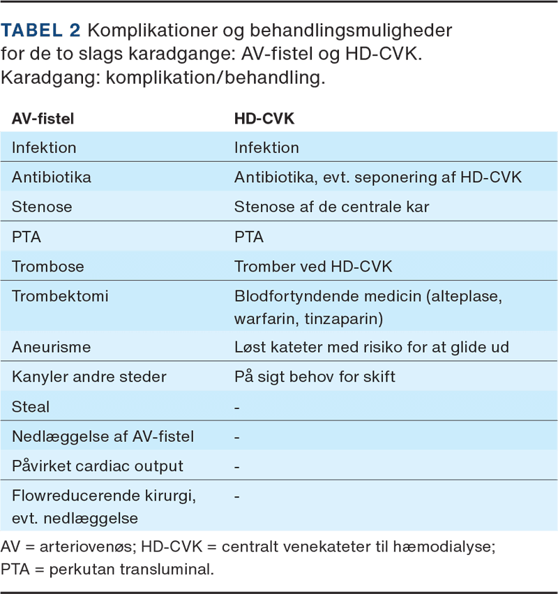 Gennem det seneste årti er HD-populationen blevet ældre med øget komorbiditet [1]. Det giver en udfordring i etableringen af en funktionsdygtig og holdbar karadgang, der minimerer komplikationerne og generne for patienten. Med tiden er flere karadgangsmuligheder kommet til. Enhver karadgang hos en patient med HD indebærer dog en række potentielle komplikationer og forholdsregler (Tabel 1 og Tabel 2), som både sundhedspersonale og patienter skal være opmærksomme på.