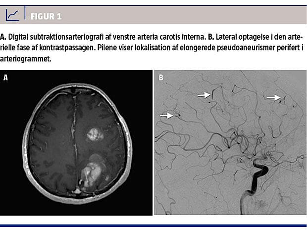 Et år senere fik patienten atter symptomer i form af pludseligt indsættende afasi og højresidig hemiparese. CT af cerebrum viste multiple parenkymatøse hæmatomer i venstre hemisfære. Gentagne MR-skanninger foretaget over de følgende måneder viste vækst af de hæmoragiske områder (Figur 1A). En ekkokardiografi viste ingen tegn til recidiv af myksom. En hjernebiopsi med histologisk undersøgelse viste ukarakteristiske forandringer uden tegn til infektion eller malignitet. Ved cerebral angiografi fandt man multiple fusiforme aneurismer på perifere a. cerebri media-grene bilateralt (Figur 1B).