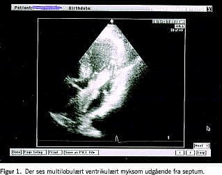 Grundet lang venteliste til transtorakal ekkokardiografi (TTE) og afbud fra patienten blev TTE'en først foretaget fem måneder efter udskrivelsen. Undersøgelsen viste et stort multilobulært myksom på 10 × 2 cm (Figur 1). Myksomet var udgående fra septum og strakte sig ned midt i venstre ventrikel. Fjorten dage senere blev det fjernet uden komplikationer.