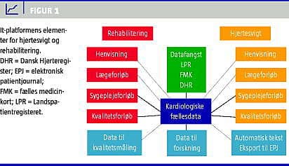 Arbejdsgruppen har peget på en løsning med én fælles database, der skal samle databaser fra de forskellige kardiologiske sygdomsområder. Der skal være én adgang via en kardiologisk it-platform, som kan udbygges efterhånden som nye sygdomsområder kommer til. Figur 1 skitserer it-platformens elementer for hjertesvigt og rehabilitering: henvisning til klinikken, besøg hos læge og sygeplejerske og et kvalitetsforløb, hvor en koordinator kan indberette særlige indikatorer, der ikke kan indsamles på anden vis. Til hvert sygdomsforløb er der defineret en selvstændig database, men på grund af stort sammenfald mellem sygdomsforløb samles alle variable i Kardiologisk Fællesdatabase. Den fælles variabeldefinition er valgt under hensyntagen til eksisterende databaser og indikatorgrupper samt ved kontakt til de forskellige arbejdsgrupper under DCS. Platformens funktionalitet skal primært begunstige de patientnære brugere, så der kan skabes tidsmæssigt råderum til at levere de påkrævede kvalitetsdata. Begunstigelsen skal bestå i datafangst fra andre registre, genbrug af fællesdata, bedre patientoverblik, beslutningsstøtte, udregning af risikoscore og automatisk generering af journaltekster til den elektroniske patientjournal.