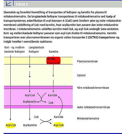 Sygdommen er forårsaget af mutationer i SLC22A5-genet, som koder for den natriumafhængige karnitintransporter organic cation transporter 2 (OCTN2) og er lokaliseret på den lange arm af kromosom 5 (5q31.1) [4, 5]. Karnitintransporteren findes i plasmamembranen i muskler, hjerte, nyrer, lymfoblaster og fibroblaster, men ikke i lever [4-6]. Den defekte karnitintransporter (Figur 1 ) forhindrer, at karnitin er tilgængeligt for transport af langkædede fedtsyrer ind i mitokondrierne. Herved kan disse fedtsyrer ikke β-oxideres, og cellen danner mindre adenosintrifosfat [1]. En defekt karnitintransporter reducerer derudover den tubulære reabsorption af karnitin i nyrerne, hvorved koncentrationen af karnitin i blodplasma falder. Den lave plasmakoncentration og den defekte transport af karnitin ind i cellerne fører til lav intracellulær karnitinkoncentration [2].