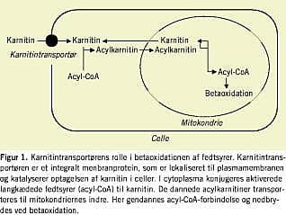 Karnitin dannes ved endogen biosyntese og indtages med kosten. Karnitin er nødvendig for transport af langkædede fedtsyrer over mitokondriemembranen (Figur 1 ). Ved svær karnitinmangel kompromitteres denne proces og dermed betaoksidationen. Fedtsyrer er vigtige energisubstrater for hjerte- og skeletmuskulatur. CTD skyldes destruktive mutationer i OCTN2 -genet, som koder for plasmamembrantransportøren for karnitin. Karnitin kan derfor ikke reabsorberes i nyretubuli, og resultatet er tab af karnitin fra organismen. Den cellulære optagelse er endvidere kompromitteret, og cellernes indhold af karnitin bliver for lavt til at opretholde sufficient betaoxidation.
