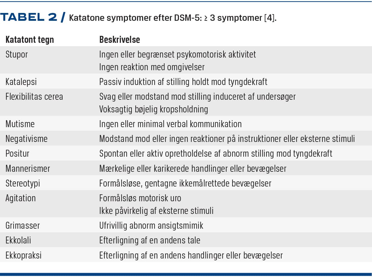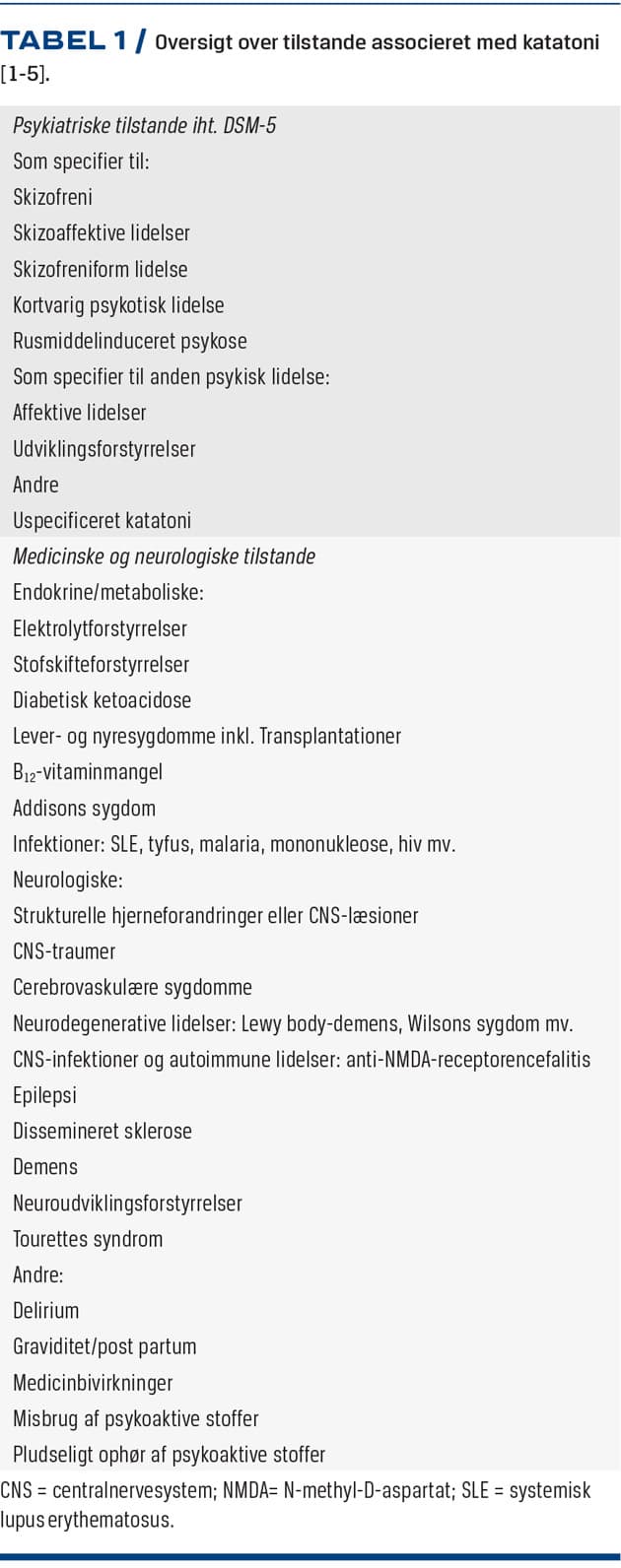 Katatoni er et neuropsykiatrisk syndrom, der er karakteriseret ved særlige motoriske symptomer samt adfærdsmæssige og autonome forstyrrelser. Tilstanden kan forekomme hos patienter i alle aldersgrupper ved en række medicinske, psykiatriske og neurologiske lidelser, herunder intoksikationer (Tabel 1). Prævalensen varierer fra 10% til 38% i forskellige psykiatriske populationsstudier, hvoraf en fjerdedel af tilfældene har en medicinsk eller neurologisk årsag. Korrekt diagnostik og behandling er af væsentlig prognostisk betydning. Imidlertid overses katatoni hyppigt og associeres fortsat primært med skizofreni. Ubehandlet er tilstanden potentielt livstruende [1-3, 6-8].