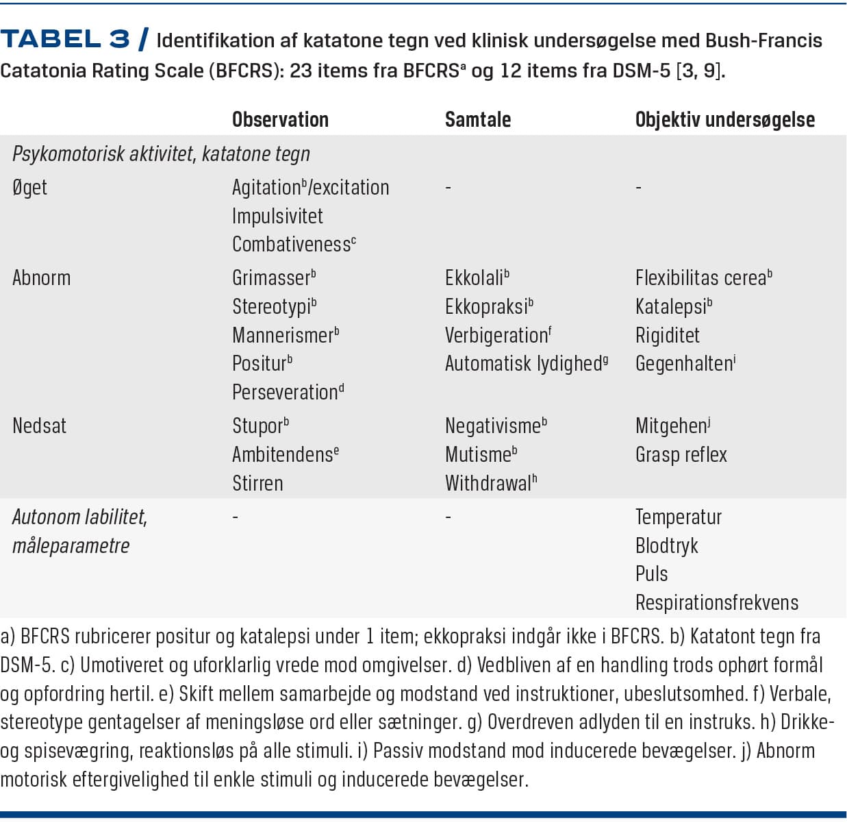 De kardinale symptomer er mutisme, stupor, katalepsi, rigiditet, flexibilitas cerea, stereotypier, mannerismer og ekkofænomener, men der er beskrevet over 60 katatone tegn, som varierer i antal og tyngde mellem de respektive diagnosesystemer og psykometriske skalaer [2-4, 9, 10, 14-16, 21]. Mens man i DSM-5 angiver blot 12 centrale katatone tegn, indgår der 23 symptomer i Bush-Francis Catatonia Rating Scale (BFCRS), som er en hyppigt anvendt bedømmelsesskala med gode psykometriske egenskaber. Med BFCRS som diagnostisk værktøj kan man identificere katatone symptomer, dels ved observation af patienten, og dels under samtale og objektiv undersøgelse (Tabel 3). Symptomerne spreder sig over rene motoriske forstyrrelser (immobilitet, rigiditet, abnorm kropsholdning), viljemæssigt ukontrollerede bevægeforstyrrelser (ambitendens, negativisme, automatisk lydighed), ufrivillige stereotype bevægeforstyrrelser (ritualer, ekkofænomener, mannerismer) og autonom labilitet. Katatone tegn som automatisk lydighed, negativisme, ambitendens og ekkofænomener opfattes ikke som udtryk for en aktiv bevidsthedsproces hos den ellers vågne patient, men ikke sjældent tolkes det som opmærksomhedssøgende adfærd [3, 5, 9, 15-19, 21-24].