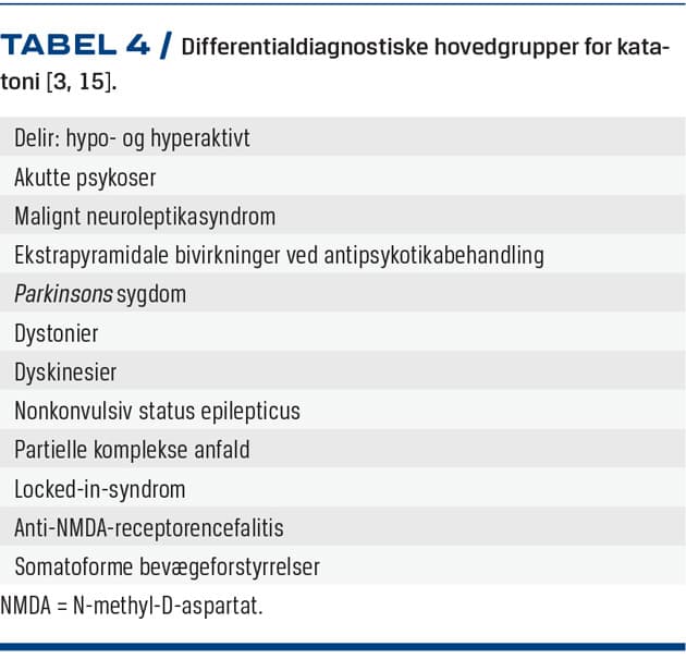 opdeles i nogle hovedgrupper med mange forskellige undergrupper, der afspejler de talrige årsager, der er fremført som årsag til katatoni. I Tabel 4 gives der eksempler herpå. Nævneværdige er autoimmune cerebrale sygdomme som anti-N-methyl-D-aspartat (NMDA)-receptorencefalitis, hvor katatone symptomer kan være meget fremtrædende [3, 15, 19].