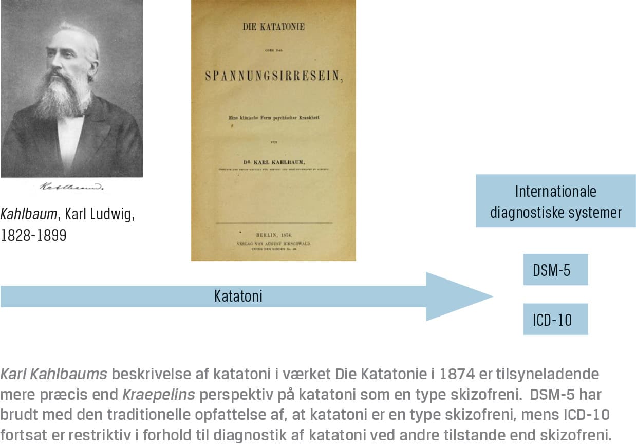 Emil Kraepelin (1856-1926), hvis psykopatologiske beskrivelser har præget de psykiatriske diagnosesystemer i det 20. århundrede, opfattede katatoni som udtryk for symptomforværring og dårligere prognose ved dementia praecox, som senere er omdøbt til skizofreni. Siden har katatoni nosologisk været forankret i skizofreni og isoleret som et psykiatrisk anliggende. Efterkrigstidens skelsættende forandringer med afinstitutionalisering af psykiatriske anstalter begrænsede muligheden for longitudinelle kliniske observationer, hvorfor katatoni mistede sin betydning – en udvikling, der er nøje skildret af den amerikanske neuropsykiater Max Fink, hvis to årtiers forskning i katatoni medførte nye diagnosekriterier for katatoni i DSM-5 i 2013 [1, 4, 6-10].
