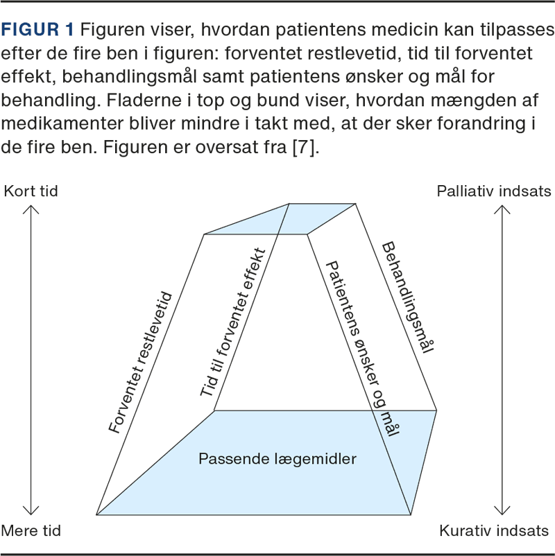 De teoretiske koncepter er modeller eller figurer, som beskriver overordnede principper for medicinseponering. Konceptet udformet af Holmes et al [7] illustrerer f.eks., hvordan rationel medicinering til ældre nødvendigvis må afhænge af en samlet vurdering af forventet restlevetid, tid til forventet effekt, behandlingsmål vurderet på en akse fra kurativ til palliativ samt patientens overvejelser om ønsker og mål for behandling (Figur 1). De teoretiske koncepter er primært anvendelige som et teoretisk baggrundsværktøj, som kan forme lægens forståelse og dermed grundlag og tilgang til medicinseponering [7, 8].