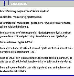 Det typiske debutsymptom ved CPVT er synkope i forbindelse med fysisk anstrengelse eller emotionel påvirkning, men ikke helt sjældent er pludselig hjertedød første symptom [1, 3]. Debutalderen er typisk mellem to og 12 år, men sygdommen kan også manifestere sig tidligere. I en undersøgelse af vuggedødsofre fandtes RyR2-mutationer således med en frekvens på 1,5% [25].