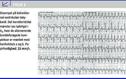 Katekolaminerg polymorf ventrikulær takykardi eller på engelsk catecholaminergic polymorphic ventricular tachycardia (CPVT) er en sjælden arvelig hjertesygdom, som kan medføre livstruende ventrikulære arytmier hos patienter med et strukturelt normalt hjerte. Sygdommen er særdeles alvorlig, da den ubehandlet ofte medfører hjertestop i en ung alder [1]. Dens navn afspejler de tidligste kliniske observationer af patienterne, og den udløsende faktor er således ofte tilstande, der er præget af hurtigt forøget sympatikustonus for eksempel fysisk anstrengelse og emotionel påvirkning. Et kardinalfund ved sygdommen er tilfælde af den såkaldte bidirektionelle ventrikulære takykardi (VT), en arytmi hvor QRS-kompleksernes akse skifter 180 grader fra kompleks til kompleks (Figur 1 ). Dog ses hyppigere den mere almindelige arytmi, polymorf VT, hvor komplekserne stadig skifter karakter. Sygdommen blev første gang beskrevet i 1975 af Reid et al [2] i en kasuistik og i 1995 af Leenhardt et al for første gang som selvstændig sygdomsenhed [1].
