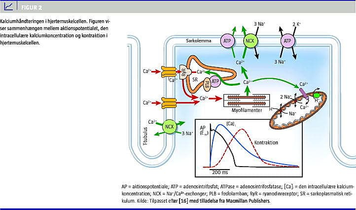 Kalcium er en af de vigtigste ioner for hjertets elektriske system og har en central rolle i både plateaufasen (fase 2) af hjertemuskelcellens aktionspotentiale og for sammenkoblingen af aktionspotentialet med kontraktion i hjertemuskelcellerne, den såkaldte ekscitations-kontraktions-kobling (Figur 2 ) [16]. Kalciums funktion i hjertemuskelcellen er knyttet til de store forskelle i kalciumkoncentration imellem det ekstracellulære rum med høj koncentration, cytosolen med lav koncentration og det sarkoplasmatiske retikulum (SR) med ligeledes høj koncentration. SR's væsentligste funktion i hjertemuskelcellen er således at virke som et intracellulært kalciumlager.