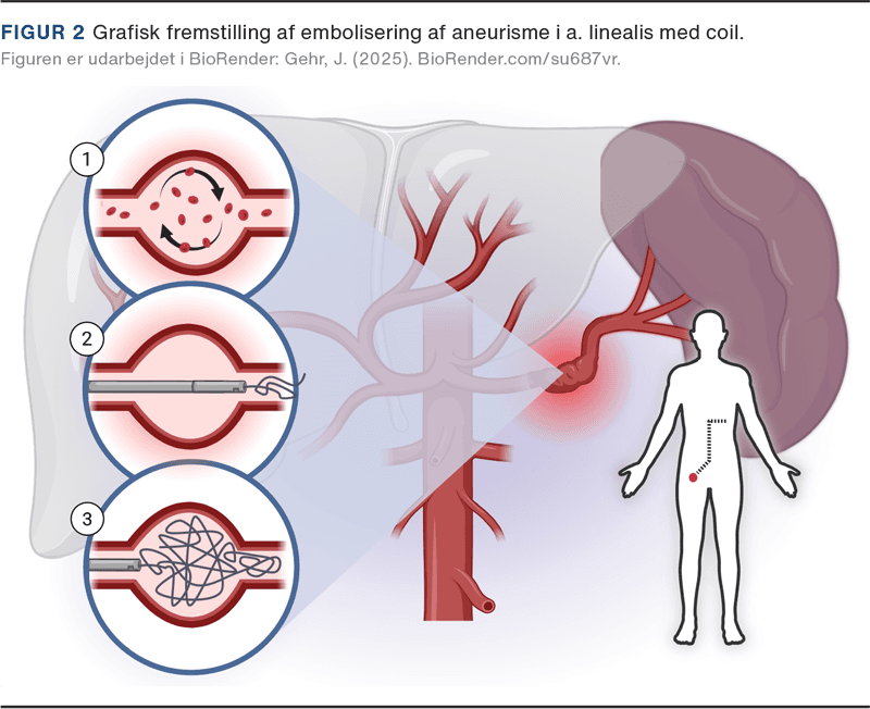 At lukke arterier kaldes embolisering og kan udføres med forskellige materialer afhængigt af karanatomi og indikation. Materialerne kan være mekaniske, flydende eller partikulære og enten permanente eller temporære. Ved akut blødning kan en læsion lokaliseres, og den ansvarlige arteriegren okkluderes hurtigt og permanent, f.eks. ved traume og blødende tumorer. Teknikken anvendes desuden ved behandling af aneurismer og pseudoaneurismer, hvor det patologiske kar lukkes for at forebygge ruptur (Figur 2). Alternativt kan aneurismer i visse tilfælde behandles med stentgraft, der virker som en foring af den syge karvæg.