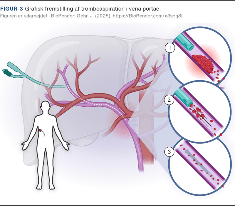 Åbning af vener har til formål at genetablere afløb i obstruerede segmenter. Denne udvikling er især drevet af fremskridt inden for mekanisk trombektomi og aspirationsteknologi. Således kan man nu oprense iliofemoral trombose (DVT) uden behov for trombolyse og ledsagende blødningsrisiko [7]. De samme tekniske fremskridt har muliggjort behandling af tromboser i mesenteriale og portale vener (Figur 3), hvor hurtig rekanalisering kan forebygge alvorlig morbiditet, herunder behov for tarmresektion [8].