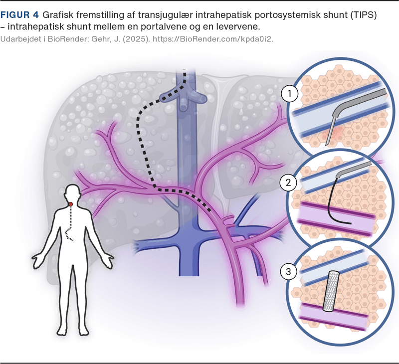 Transjugulær intrahepatisk portosystemisk shunt (TIPS) adskiller sig fra øvrige venøse indgreb ved hverken at åbne eller lukke kar. Proceduren anvendes ved portal hypertension og indebærer etablering af en kanal gennem leverparenkymet mellem en portalvene og en levervene. Kanalen holdes åben med en stentgraft (Figur 4), og herved reduceres portaltrykket og risikoen for komplikationer som ascites og variceblødning. Randomiserede studier har vist, at tidlig TIPS ved variceblødning reducerer risikoen for reblødning og forbedrer overlevelsen [11].