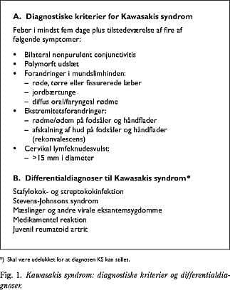 Der findes ingen diagnostiske test for KS. Diagnosen er derfor klinisk og stilles ud fra en række kriterier (Fig. 1 A), idet et antal differentialdiagnoser skal være udelukket Fig. 1B). Diagnostik af den forholdsvise sjældne tilstand vanskeliggøres af, at de definerende symptomer også findes enkeltvis ved en række almindelige sygdomme, samtidig med at der kan ses atypiske bisymptomer (ledgener, abdominalsmerter m.m.). Desuden optræder inkomplet KS, hvor ikke alle de diagnostiske kriterier er opfyldt. Heraf følger, at der er risiko for, at nogle tilfælde overses, eller at behandlingen forsinkes. Behandlingen består i intravenøs γ -globulin (IVGG) og acetylsalicylsyre, som reducerer inflammationen og derved incidensen af aneurismer. Brug af steroid har været kontroversiel og betragtet som kontraindiceret, da tidlige rapporter tydede på øget forekomst af aneurismer hos steroidbehandlede patienter. Imidlertid tyder nye publikationer på, at steroid kan have en plads i behandlingen af KS, fx ved svære, immunglobulinresistente tilfælde (3).