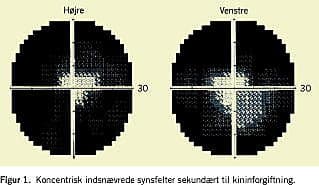 Ved en oftalmologisk undersøgelse fandtes visus reduceret til håndbevægelser bilateralt, og pupillerne var dilaterede og lysstive, men patienten var i øvrigt neurologisk intakt. Man bemærkede vermiforme bevægelser af pupilsømmene ved lysstimulation. En oftalmoskopi viste ud over afsmalning af arteriolerne normale forhold. På baggrund af anamnesen og de kliniske fund blev patienten indlagt på medicinsk afdeling på mistanke om kininforgiftning, og der blev indledt behandling med aktivt kul efterfulgt af hæmodialyse. Paraklinisk fandt man ved elektrokardiogram, blodtryksmåling og standardblodprøver normale forhold, fraset let forhøjet C-reaktivt protein på 31 mg/l. Efter et døgns telemetri uden tegn på hjerterytmeforstyrrelser blev hun udskrevet til videre kontrol på øjenafdelingen. I løbet af en uge bedredes det centrale visus til knap 0,63 bilateralt, og seks uger efter indlæggelsen var visus bedret til 1,0 på begge øjne. Imidlertid havde patienten fortsat svært ved at orientere sig i uvante omgivelser og klagede over natteblindhed og ændret farveopfattelse. En computerperimetri viste bilateralt koncentrisk indskrænkede synsfelter (Figur 1 ). Oftalmoskopisk fandtes fortsat afsmalnede og kalibervekslende arterioler. Pupillerne var normalt reagerende for lys og normal visual evoked potential (VEP) tydede på intakt funktion af n. opticus. Et elektroretinogram (ERG) tre måneder efter indlæggelse var dog svært abnormt og viste karakteristisk reduceret amplitude af b-bølgen under fotopisk stimulation, hvilket tydede på varig skade på retinas intermediære cellelag, såsom Müller-celler, amakrine celler og ganglionceller.