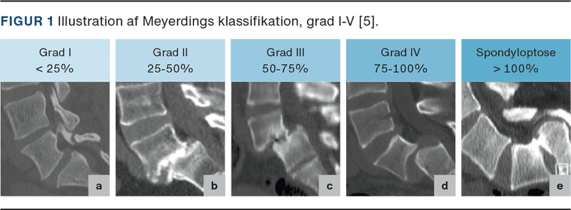 SL graderes ud fra Meyerdings klassifikation i grad I-IV på baggrund af, hvor mange procent den kranielle hvirvel er gledet fremad i forhold til den kaudale. Grad I er fremadglidning på op til 25% af ryghvirvlens sagittale længde, grad II er 25-50%, grad III er 50-75%, mens grad IV er 75-100% (Figur 1) [5].