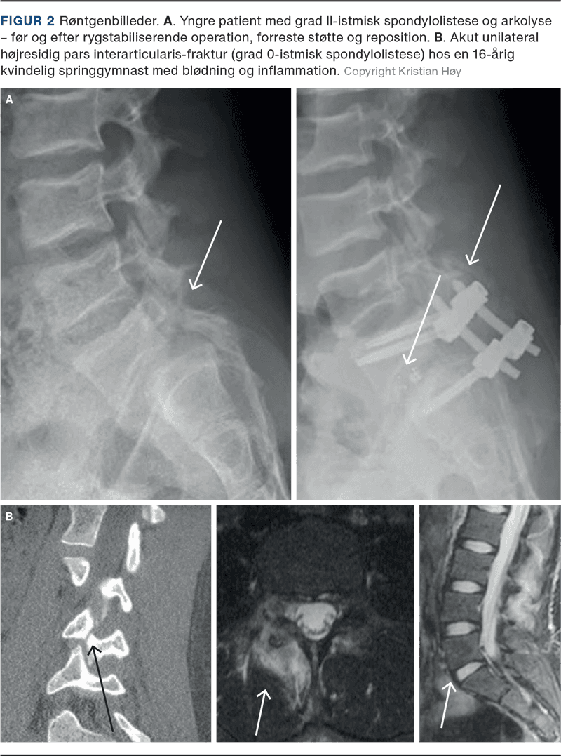 Symptomgivende ISL ses primært hos børn og unge i teenageårene og kan skyldes talrige mikrotraumer i pars interarticularis forårsaget af stress efter gentagne lumbale ekstensioner f.eks. udløst af gymnastik eller kampsport (Figur 2B). Visse befolkningsgrupper, særligt grønlændere, er genetisk prædisponerede for udvikling af ISL, og ca. 30% af grønlænderne har ISL [7, 11]. Det er usandsynligt, at grønlændere har flere mikrotraumer end øvrige befolkningsgrupper, og derfor er en arvelig komponent med manglende ossifikation af pars interarticularis (arkolyse) plausibel. Columna er primært afficeret ved L5-S1-leddet. Symptomer ved ISL opstår typisk i to perioder – første gang i 5-7-årsalderen og anden gang i puberteten. Der er ved ISL modsat ved DSL en overrepræsentation af hankøn i forholdet 2:1, og prævalensen af ISL er 2,6-11,5%, svarende til 1-2 børn i hver skoleklasse. Blandt børn med bilateral spondylolyse (arkolyse) forekommer ISL i 40-66% af tilfældene [12, 13].