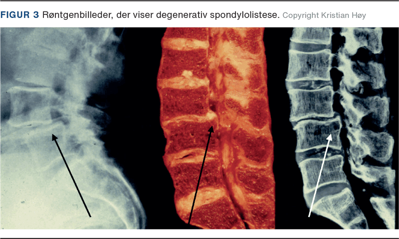 Spondylolistese (SL) er en vigtig diagnose at overveje. SL er en sagittal rygsøjledeformitet, hyppigst i lænderegionen, hvor en kraniel hvirvel er gledet fremad i forhold til den kaudale [3]. SL inddeles i fem typer: den degenerative (DSL), den istmiske (ISL), den traumatiske, den dysplastiske og den patologiske. DSL og ISL er de hyppigste [3]. Traumatisk SL ses ved traumer med direkte skade på pars interarticularis eller facetleddene. Dysplastisk SL opstår som følge af en kongenit abnormalitet i columna. Patologisk SL opstår sekundært i forbindelse med bindevævssygdomme, neoplasi og infektion eller iatrogent [3, 4].