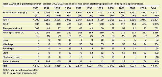 I Tabel 1 ses antallet af operationer pr. år og fordelingen af indgreb, der blev foretaget. I 2003 blev der foretaget 21% færre operative indgreb på prostata end i 1993. Standardoperation (TUR-P, transuretral prostataincision (TUI-P) og åben prostatektomi) blev foretaget hos 93-97% i perioden, og TUR-P udgjorde langt den største del. Anvendelsen af åben prostatektomi, der udføres ved store prostatavolmina, var konstant i forhold til det totale antal operationer fraset enkelte år med en lav anvendelse. Brugen af TUI-P, der anvendes ved sm å prostatavolumina, steg marginalt.