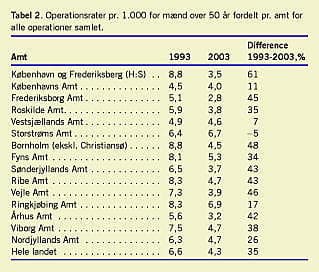 Operationsrater pr. 1.000 mænd over 50 år i de enkelte amter i henholdsvis 1993 og 2003 er vist i Tabel 2 . Der ses en stor variation amterne imellem i raten i de enkelte år og i ændringen inden for de enkelte amter fra 1993 til 2003. Den mediane operationsrate pr. 1.000 mænd over 50 år var 6,5 i 1993 og 4,5 i 2003, og den mediane difference i de enkelte amter var 38%. De aldersspecifikke operationsrater i henholdsvis 1993 og 2003 for alle amter samlet ses i Figur 1 .