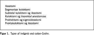 Crohns sygdom kan afficere hele gastrointestinalkanalen, men er oftest lokaliseret til tyndtarmen (25-30%), colon (20-25%) eller tyndtarm og colon (ca. 40%) [1]. Affektion af ventrikel/duodenum ses hos ca. 5% af patienterne [2], mens anorektal Crohn uden anden affektion findes hos 3-4%. Medicinsk behandling er ofte utilstrækkelig, og hos 70% er kirurgi nødvendig inden for de første ti år [3]. Reoperation er også ofte nødvendig, og det er således beregnet, at patienter med mb. Crohn i gennemsnit gennemgår 2,5 tarmoperationer. Efter tyndtarmsresektion findes risiko for malabsorbtion af forskellig art og sværhedsgrad, men egentlig korttarmssyndrom udvikles hos færre end 1% af patienterne [4]. Denne oversigt er baseret på artikler fundet ved MEDLINE-søgning på søgeordene: Crohn disease, surgery, strictureplasty, controlled clinical trials, inflammatory bowel diseases, short bowel syndrome, surgical procedures, endoscopic. Der er søgt på ordene enkeltvis og i kombination. Meget få studier er randomiserede, og anbefalingerne er derfor primært baseret på fund i større retrospektive opgørelser og konklusioner i internationale oversigtsartikler.