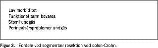 Med hensyn til colon-Crohn er valget af procedure mindre klart defineret, og der vil ofte være flere valgmuligheder (Figur 1 ). Hvis inflammationen omfatter store dele af colon og rectum, vil det naturlige valg være proktokolektomi med ileostomi, men når flere segmenter af colon er sparet, kan der være grund til at bevare disse segmenter. Anvendelse af ileostomi alene er i reglen kun indiceret ved de situationer, hvor man har behov for at få ro i sygdommen, og hvor senere definitiv kirurgi bliver aktuel. Kolektomi med ileorektal anastomose kan være et godt valg, hvis rectum ikke er inddraget, og hvis kapaciteten i rectum ikke er nedsat [11]. Når man vælger segmentære resektioner for colon-Crohn, vil det betyde en større recidivtilbøjelighed, end hvis proktokolektomi vælges [18], men dette opvejes ofte af de mange fordele, som er anført i Figur 2 . Ved fistulerende anorektal sygdom anbefales anvendelse af myokutan flap i forbindelse med proktektomi, idet man herved opnår bedre heling af perinealsåret [19]. For mange patienter med inflammatorisk tarmsygdom er udsigten til stomi afskrækkende, og hvis man anvender segmentære resektioner som led i behandlingen af udvalgte patienter, vil en stor del kunne undgå permanent stomi [20]. Anorektale manifestationer øger risikoen for permanent stomi betydeligt [21]. På grund af risiko for malignitet er det vigtigt at bioptere stenoser i colon [22]. Hvis stenoser ikke kan evalueres endoskopisk og histologisk, er resektion det sikreste [22].