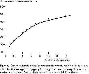 Som det tidligere er omtalt, har Crohns sygdom en udtalt tilbøjelighed til at vise sig igen efter resektion, og allerede få måneder efter en resektion findes små ulcerationer anastomosenært hos de fleste patienter [33]. Der findes også en betydelig risiko for, at patienterne senere har brug for et operativt indgreb (Figur 3 ).