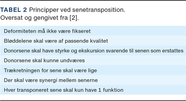 En række vigtige principper følges, når senetranspositioner planlægges (Tabel 2). Der bør minimum være styrke 4 i den muskel-sene, der transponeres, hvis man skal forvente brugbar aktivitet i den transponerede muskel, idet der tabes 1 styrkegrad ved transpositionen. Det kan være nødvendigt at transponere en muskel-sene med styrke 3, hvis man herved fjerner en deformerende kraft. Transposition af en fasisk sene foretrækkes frem for transposition af en nonfasisk. Nervesystemet kan omprogrammeres til at benytte en given muskel, som normalt bøjer anklen, til at strække anklen i koordination med de øvrige funktionelle muskler, der indgår i bevægelsen.