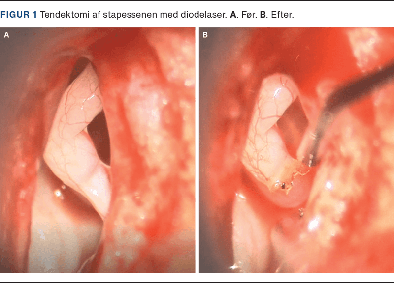 Ved venstresidig eksplorativ tympanotomi i lokalanæstesi kunne man konstatere, at når patienten kneb venstre øje sammen, blev der udløst synkrone kontraktioner af musculus stapedius. Efter samråd med patienten blev stapessenen brudt med diodelaser 1 W (Figur 1 A + B). Umiddelbart postoperativt kunne patienten fortælle, at smerterne og kliklyden i øret var fuldstændigt forsvundet. De tidligere gener var fortsat fraværende ved tremånederskontrol, men i støjfyldte omgivelser bemærkede patienten øget lydoverfølsomhed.