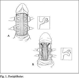Der fremkaldes kunstig erektion ved infusion af saltvand i det ene corpus og den kongenitte deviation er ofte nedad og/eller til venstre. Incisionen lægges over den maksimale konveksitet og den relativt for lange side af tunica albuginea forkortes passende ved plissering med en uresorberbar sutur (prolene eller gortex 2-0) (1), (Fig. 1 ).