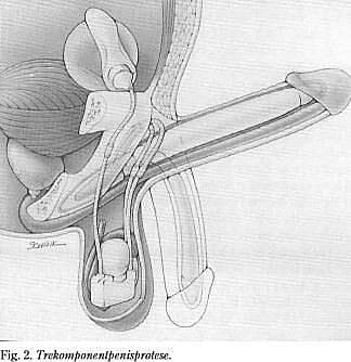 Trekomponentprotesen (Fig. 2 ), som først beskrevet af Scott et al (9), havde en række tekniske problemer (fx herniering af cylindre, fejl i pumpen, afklemning af slanger og defekte slangesamlinger). Nyere modeller af trekomponentproteserne har ikke disse problemer, og en dacron-strømpe i cylindervæggen tillader kontrolleret ekspansion af både diameter og længde under erektion.