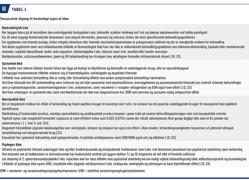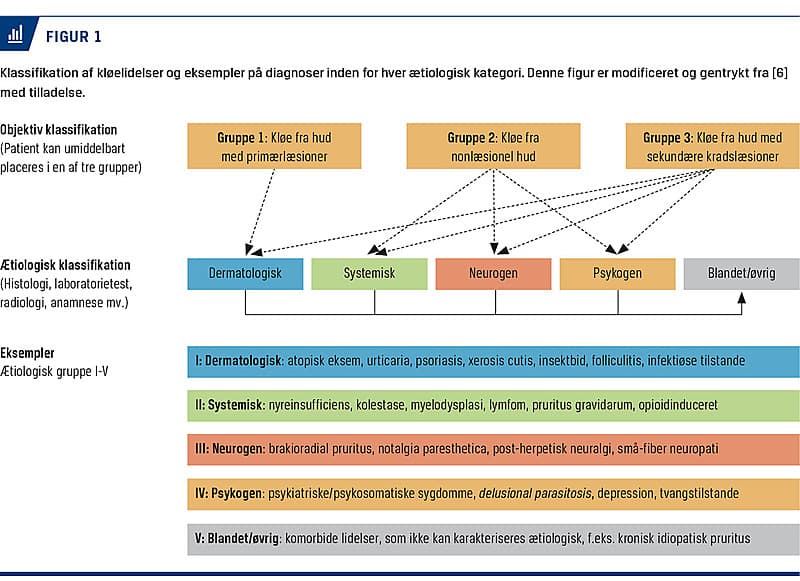 Den heterogenitet, der er forbundet med kløetilstande, og den kliniske udfordring i at opnå tilfredsstillende behandling lægger op til en systematisk og rationel tilgang til behandling af kløeplagede patienter [6, 17, 18]. Selv om en række lægemidler med kløestillende effekt er tilgængelige, og nye effektive biologiske lægemidler er undervejs, er det afgørende så vidt muligt at matche antipruritiske lægemidler med den formodede underliggende mekanisme hos en given patient [17, 19-21]. I mange tilfælde er succesfuld og omkostningseffektiv kløebehandling betinget af, at man kender kløens ætiologi [11, 19]. Der har indtil det seneste årti ikke være en alment anerkendt klassificering af kløetilstande. I 2007 udgav et ekspertpanel fra International Forum for the Study of Itch en praktisk orienteret, klinisk kløeklassifikationsmodel [6]. Denne model og den tilhørende terminologi er baseret på ny v m den neurobiologiske basis for kløe samt kliniske kløekarakteristika og er udgangspunktet for klassifikationstilgangen i denne artikel.