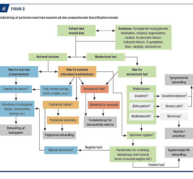 Det er værd at bemærke, at primærlæsioner både kan være omgivet af og forværres af sekundære kradslæsioner (gruppe 1). Derudover kan dermatoser være usynlige (f.eks. i visse tilfælde af mastocytose), hvorved de falder i den objektive klassifikationsgruppe 2 eller 3, om end de ætiologisk hører til i kategori I. I Figur 2 præsenteres en systematisk diagnostisk tilgang til patienter med kronisk kløe baseret på ovenstående klassifikationssystem.