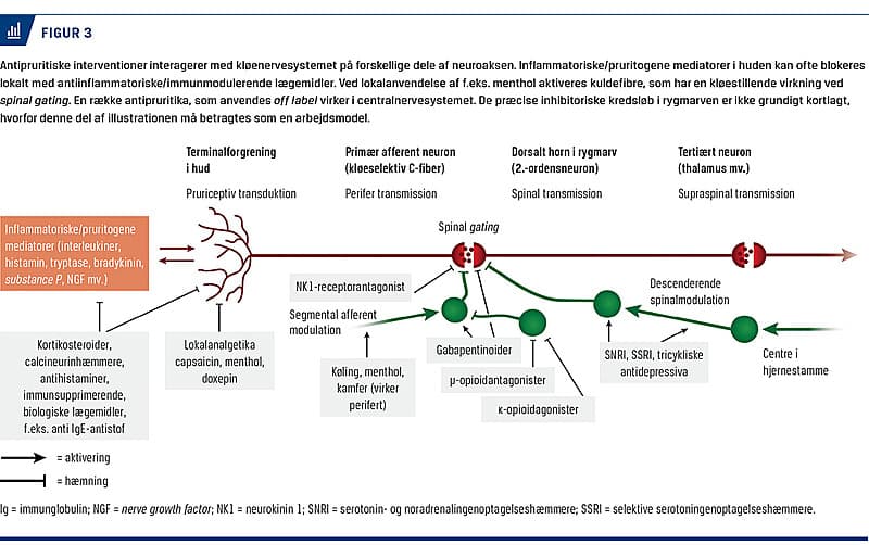 En række parallelle processer kan give ophav til signalering af kløe. Transmission af kløe moduleres aktivt på flere niveauer (perifert, spinalt og supraspinalt) [10, 12, 24]. Derfor giver det mening at anlægge en mekanistisk tilgang til udredning og behandling af de patienter, som har kronisk kløe. Dette underbygges af nye målrettede farmakologiske interventioner, som virker på forskellige perifere mediatorer eller på forskellige niveauer i kløesignaleringsvejene (Figur 3). Antihistaminer, som kan være effektive ved urticaria og mastocytose, har ved de fleste kroniske kløetilstande en ubetydelig eller slet ingen effekt [19, 23, 25, 26] og kan derfor ikke anvendes som et »generelt« antipruritikum (modsat udbredt praksis). Anvendelse af den præsenterede tilgang til klassifikation og behandling af kløe giver klinikeren et overblik over kløeætiologier og de forhåndenværende terapeutiske muligheder, hvilket kan udnyttes til generelt at optimere kløelindrende behandling.