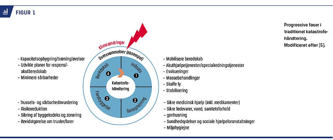 Klimaforandringer og klimavariabilitet er på en gang erklæret for at være de største trusler for human sundhed i det 21. århundrede [1, 2] og rummer ved målrettede indsatser samtidig nye muligheder for folkesundheden [2]. For at imødegå de mange klimarelaterede farer med potentiale for udvikling af regulære naturkatastrofer søger nationale myndigheder således i mange sektorer at gardere sig ved strategiudvikling, lovgivning og fremsættelse af regulativer og standarder. Disse skal medvirke til at minimere sundhedskonsekvenserne af naturkatastrofer og fremme sundhedsmulighederne. Internationalt har regeringer og organisationer etableret fælles rammebetingelser for tilgangen til katastrofehåndtering. Disse er formuleret i »Sendai framework for disaster risk reduction 2015-2030« [3]. For at sikre bedre koordinering af indsatser mellem internationale humanitære organisationer, der er aktive i håndtering af katastrofer, etableredes der i 2005 et fælles klyngesystem, som skal medvirke til mere effektiv og hurtigere respons og genopbygning [4]. Internationale katastrofeindsatser inden for sundhedssektoren koordi-